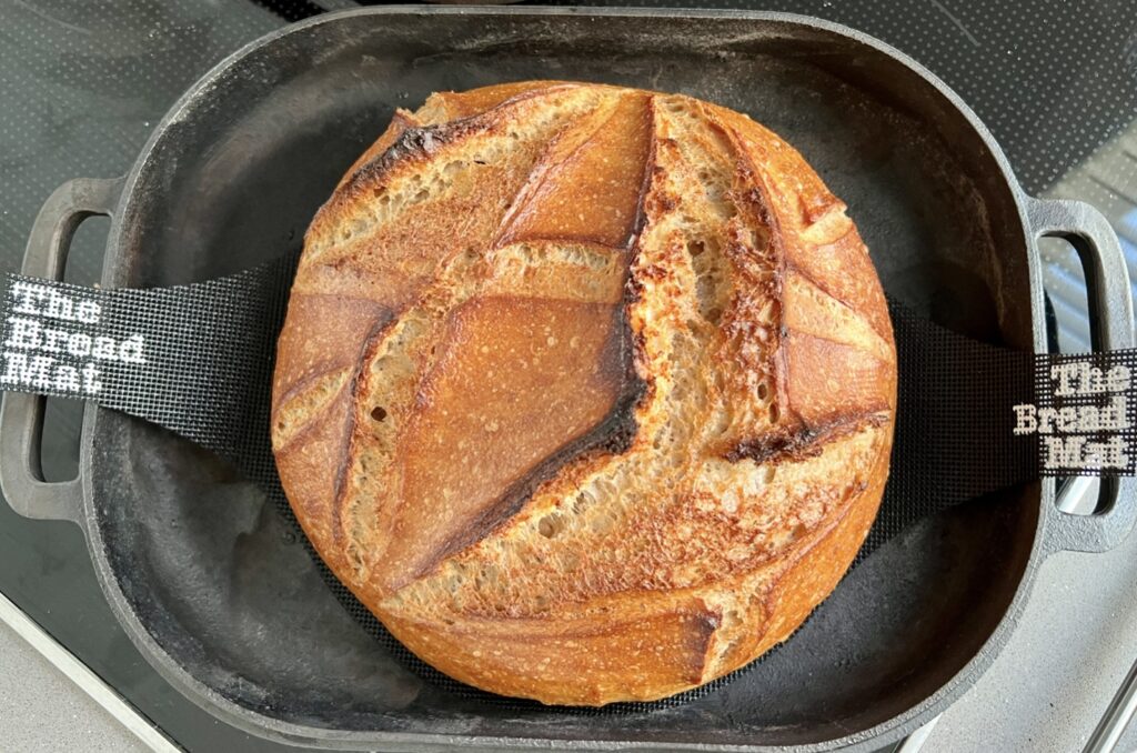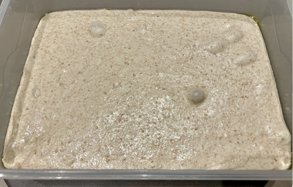 Ohjeen mukaisesti sekoitin ensin esitaikinan, jauhot ja veden (-100g) tasaiseksi. Odotin 30 minuuttia ja lisäsin suolan ja loput vedestä. Ohjeesta poiketen en käyttänyt slap and fold -vaivaamista, vaan tein sen kulhossa, kunnes taikina läpäisi kalvotestin. Ensikohotuksen alkupuolella tein neljä kertaa taittelut puolen tunnin välein. Ensikohotus kesti 4,5 tuntia +25°C lämpötilassa. Yhdessä kuvista on taikina juuri ennen muotoiluja. kylmälepo jääkaapissa noin 10 tuntia. Paisto Challenger -padassa +250°C / 20 min. kansi päällä ja kaksi jääpalaa alussa kannen alle lisähöyryksi. +225°C / 15 min. kunnes leivän sisälämpötila oli +98°C.