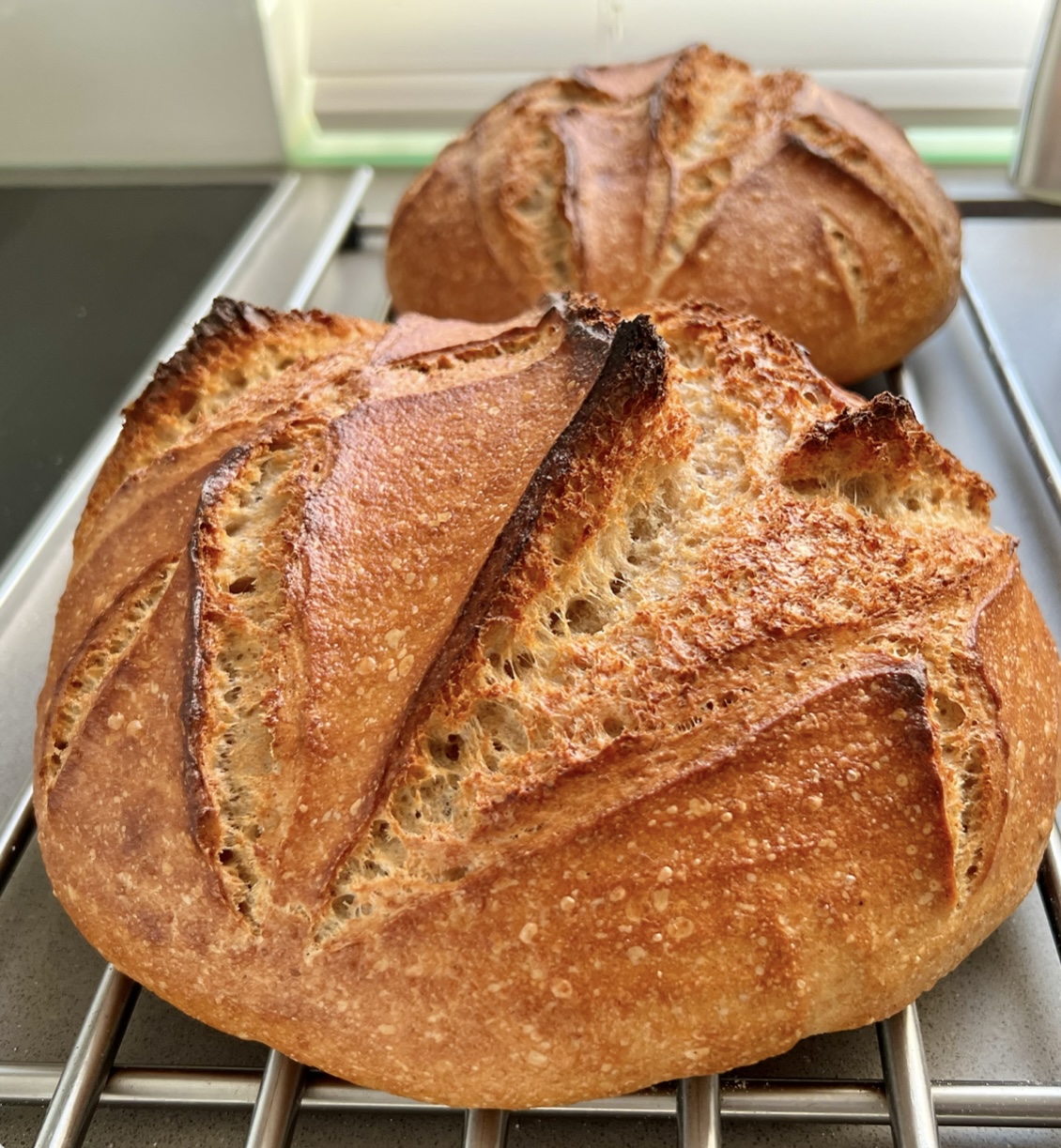 Leivät onnistuivat kohtuullisesti. Nämä ovat esimerkkejä käsialastani: tavoittelen ruskeankirjavaa paistopintaa. En jauhota koreja, koska leipä irtoaa vaivatta muutenkin. Vehnäjauho paistuu usein likaisenoloiseksi. Riisijauho tosin pysyisi valkoisena.