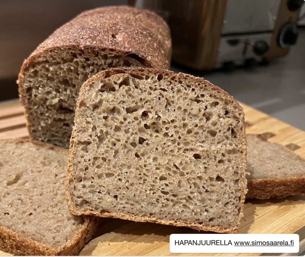 Leipiin tuli tavoitellun mukainen ruskea paistopinta, jota täydentää kuoriosan rapeus. Leivän sisus on sopivan avoin ja pehmeä. Maku on aromikas ja vain lievästi hapan. ”Potkua” saisi täysjyväleivässä olla enemmänkin! Kaikenkaikkiaan opettavainen onnistumisen kokemus.