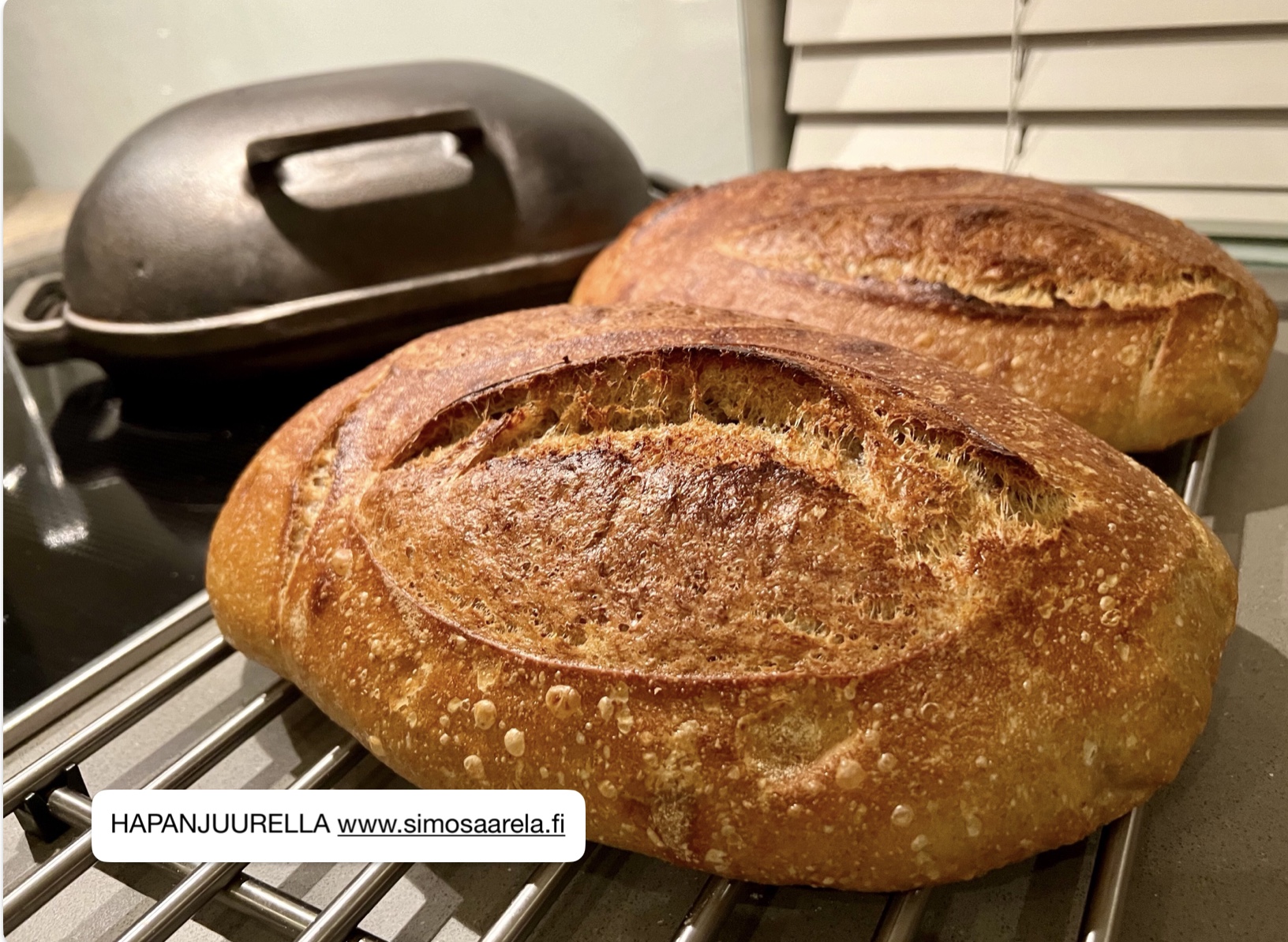 Näiden kahden leivän taikinassa on jauhoja yhteensä 1200 g. Isot leivät paistoin Challenger Bread Pan -miniuunissani. Kahden hengen taloudessa iso leipä kannattaa pakastaa neljänneksinä tai siivuina. Taikinan vaivaaminen onnistui käsin, vaikka Ankarsrumilla olisi voinut sujua vaivattomammin. Käsin tehdessä taikinaan on parempi tuntuma ja satun pitämään sen käsittelemisestä. Jauhoseoksessa on pieni määrä ruista antamaan makua ja väriä leipien paistopintaan.