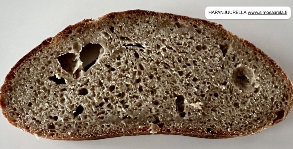 Paistolämpötila +250°C padan kansi päällä 20 min. ja +230°C noin 15 min., kunnes leivän sisälämpötila oli +98°C ja paistoväri sopiva. Leivän rakenne on avoin.